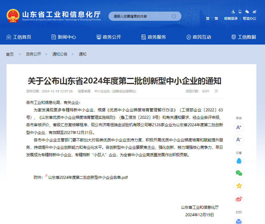 2024年12月19日,山東省工業(yè)和信息化廳公布了山東省2024年度第二批創(chuàng )新型中小企業(yè)名單,經(jīng)過(guò)嚴格的篩選和評審,晶華藥玻憑借其在技術(shù)創(chuàng )新、產(chǎn)品研發(fā)和市場(chǎng)拓展等方面的卓越表現,成功入選山東省2024年度第二批創(chuàng )新型中小企業(yè)名單。