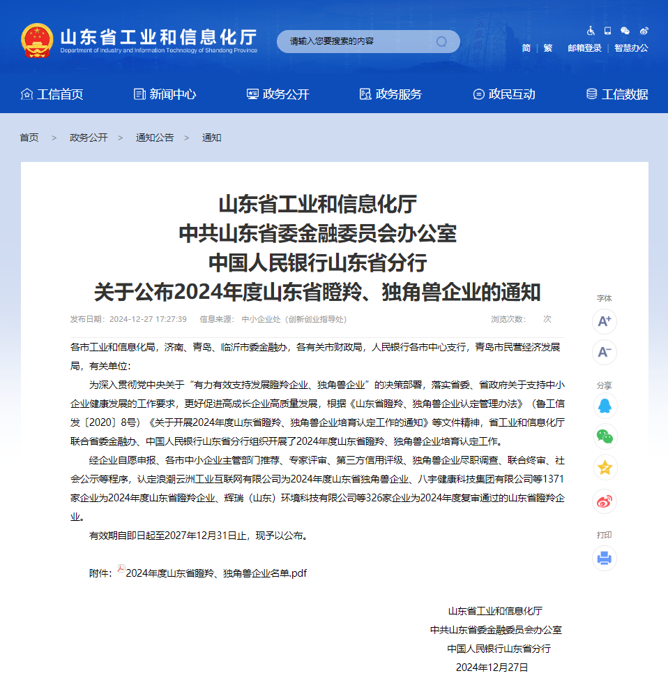 2024年12月27日,山東省工業(yè)和信息化廳發(fā)布《關(guān)于公布2024年度山東省瞪羚、獨角獸企業(yè)的通知》晶華藥玻成功入選山東省瞪羚企業(yè)名單。